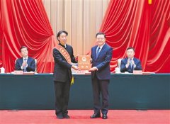 自治区科学技术奖励大会在呼召开 王伟中讲话 包钢主持 十一月二十七日,自治区党委书记王伟中为科学技术进步特等奖第一完成人张鹏举颁奖。 本报记者 马建兵