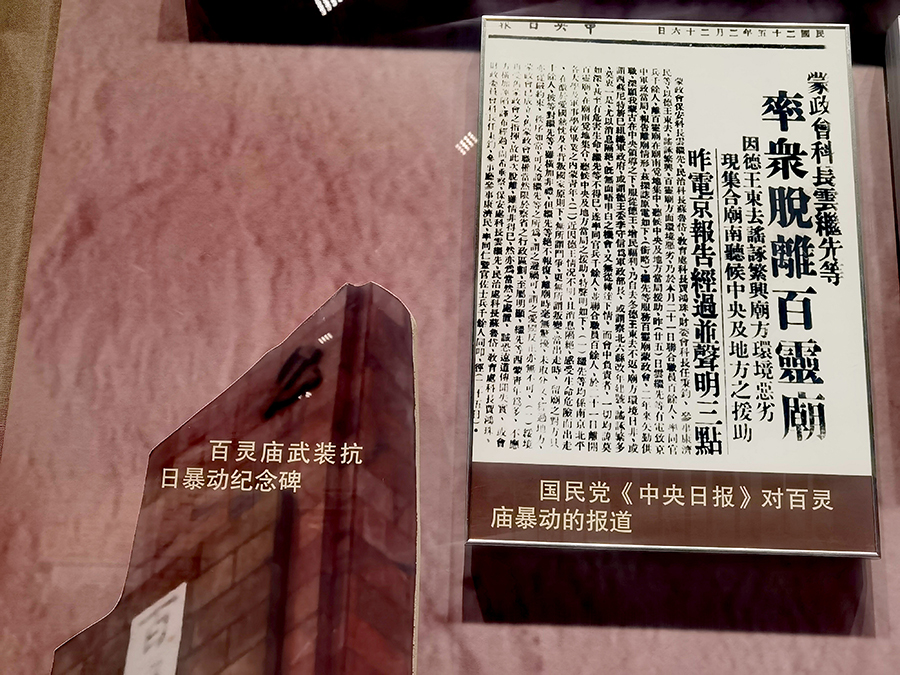 陈列在内蒙古博物院对百灵庙抗日武装暴动的报道复印件。新华网 徐红梅摄